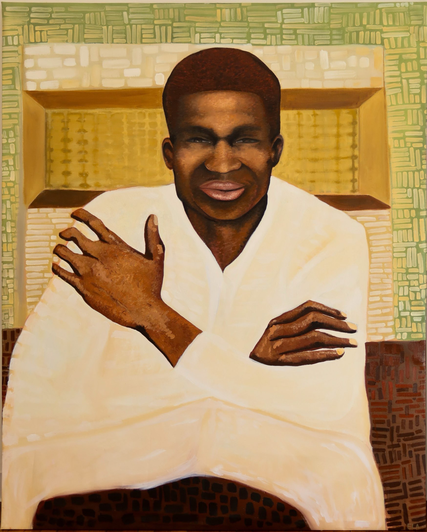 A seated figure smiling in silence, representing warmth, spirituality, and emotional belonging.